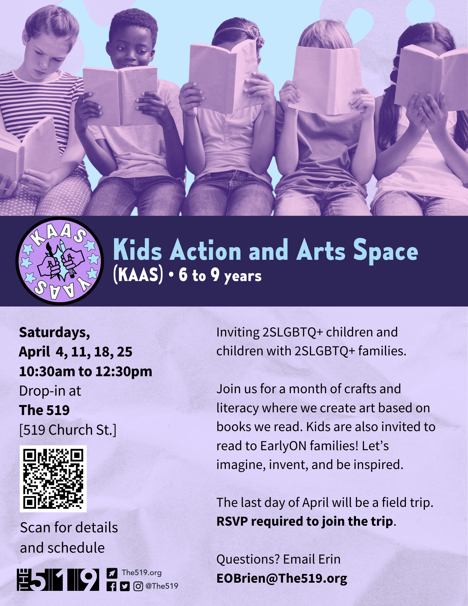 The 519’s Kids Action and Arts Space (KAAS) is a free, drop-in program that offers youth who are 6 to 9 years old a fun place to connect, meet friends and new peers.