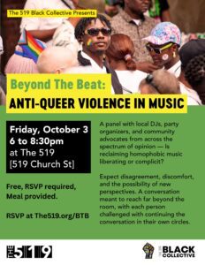 The 519 Black Collective presents Beyond the Beat: Anti-Queer Violence in Music, an in-person panel at The 519, on Friday, October 3 from 6 to 8:30 pm. This panel will be moderated by Courtnay McFarlane, and will include Polly Perry, Dr. ABC, Craig Dominic, DJ Blackcat, DJ Fresh Kidd, Kevin “Bubbles” Adams, and more. There will be a delicious meal, and brief dance party following the discussion.