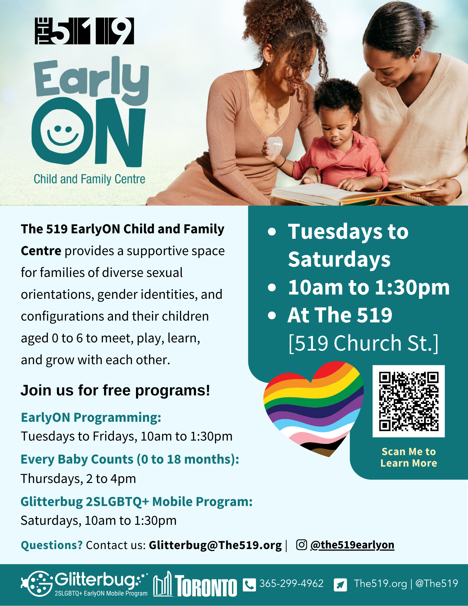 The 519 EarlyON Child and Family Centre is a supportive space for families of diverse sexual orientations, gender identities, and configurations and their children (0 to 6 years) to meet, play, talk, learn, and grow with each other.