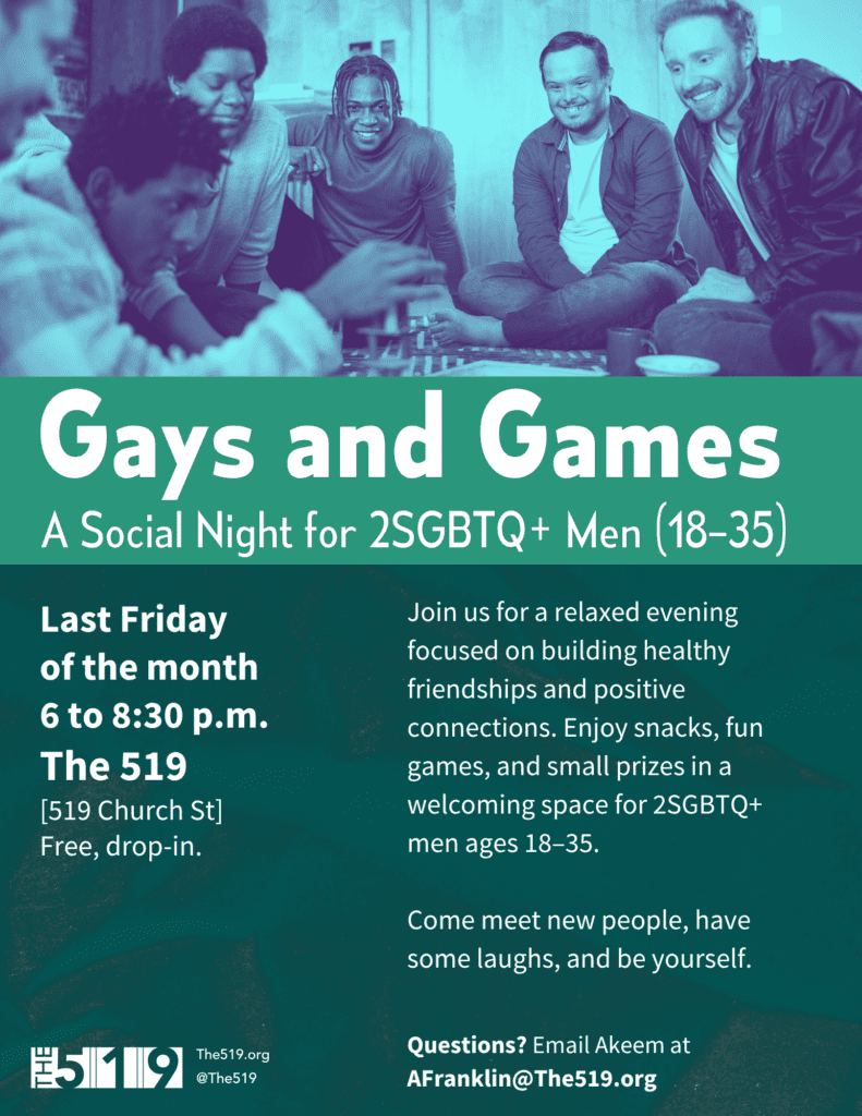 Join us on the last Friday of every month from 6 to 8:30 p.m. for a relaxed evening at The 519, focused on building healthy friendships and positive connections.