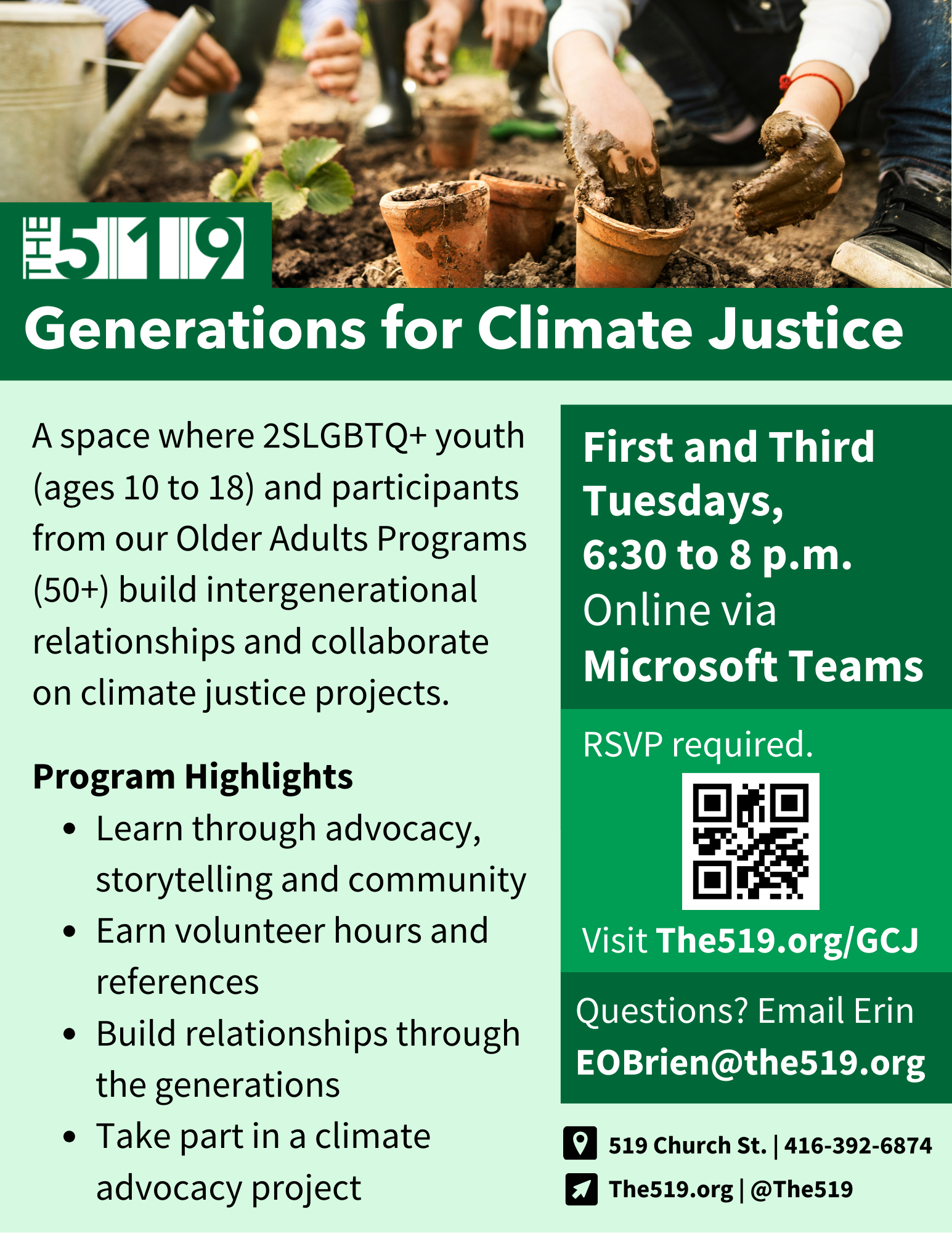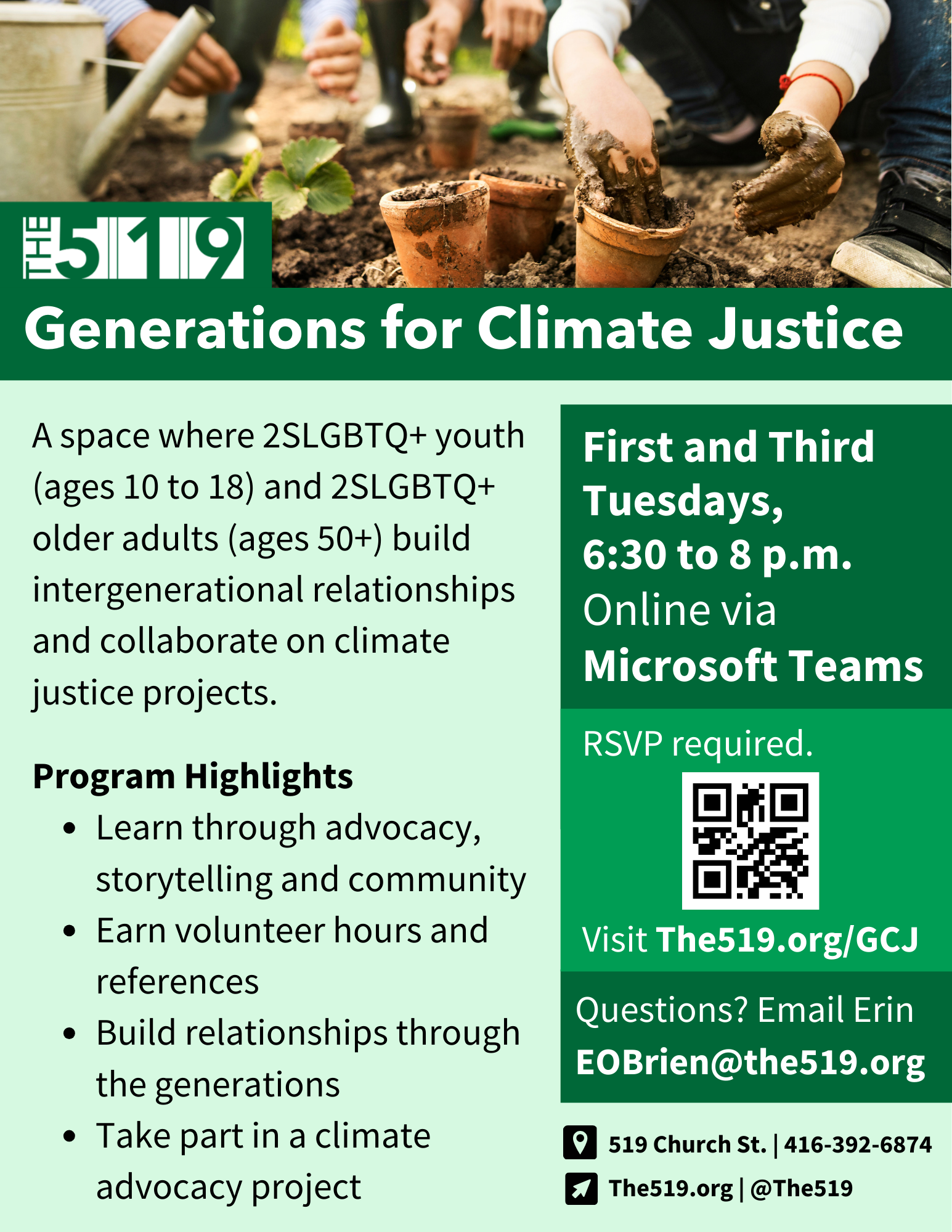 Generations for Climate Justice (GCJ) is a free program that connects 2SLGBTQ+ youth (ages 10 to 18) and 2SLGBTQ+ older adults (ages 50+) to build impactful intergenerational relationships and foster collaboration on climate justice projects.