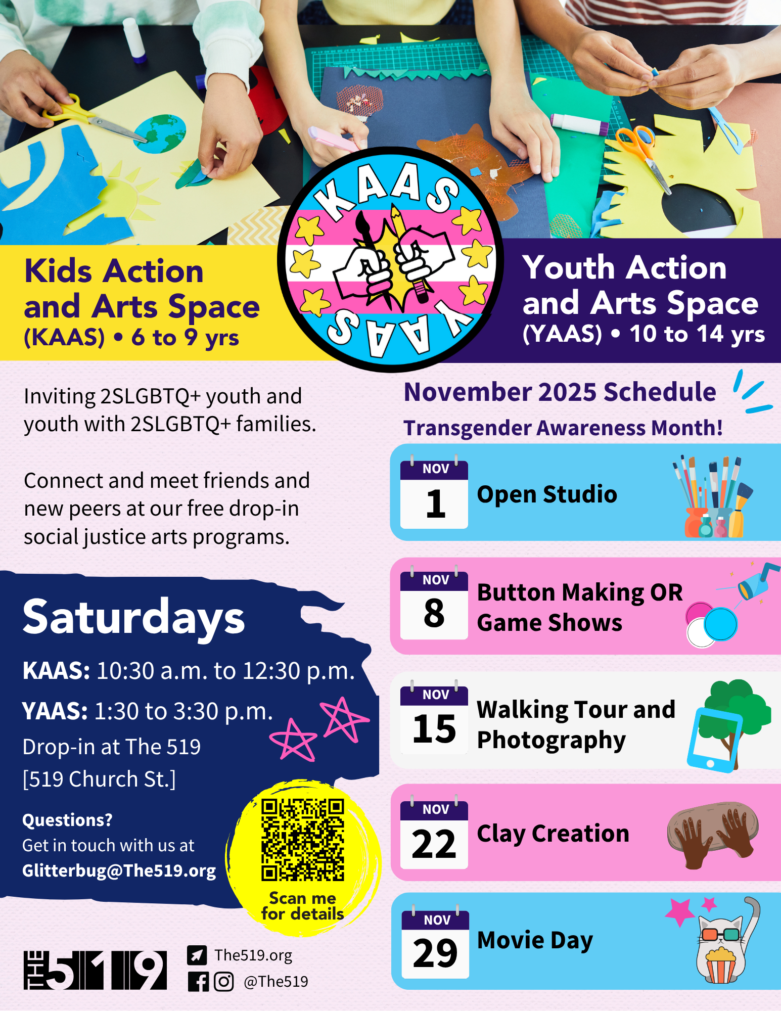 The 519’s Youth Action and Arts Space (YAAS) is a free, drop-in program that offers youth who are 10 to 14 years old a fun place to connect, meet friends and new peers.